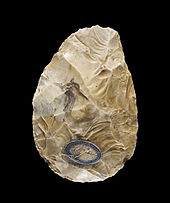 The earliest stone tools were crude, being little more than a fractured rock. In the Acheulian era, beginning approximately 1.65 million years ago, methods of working these stone into specific shapes, such as hand axes emerged. The Middle Paleolithic, approximately 300,000 years ago, saw the introduction of the prepared-core technique, where multiple blades could be rapidly formed from a single core stone.[23] The Upper Paleolithic, beginning approximately 40,000 years ago, saw the introduction of pressure flaking, where a wood, bone, or antler punch could be used to shape a stone very finely